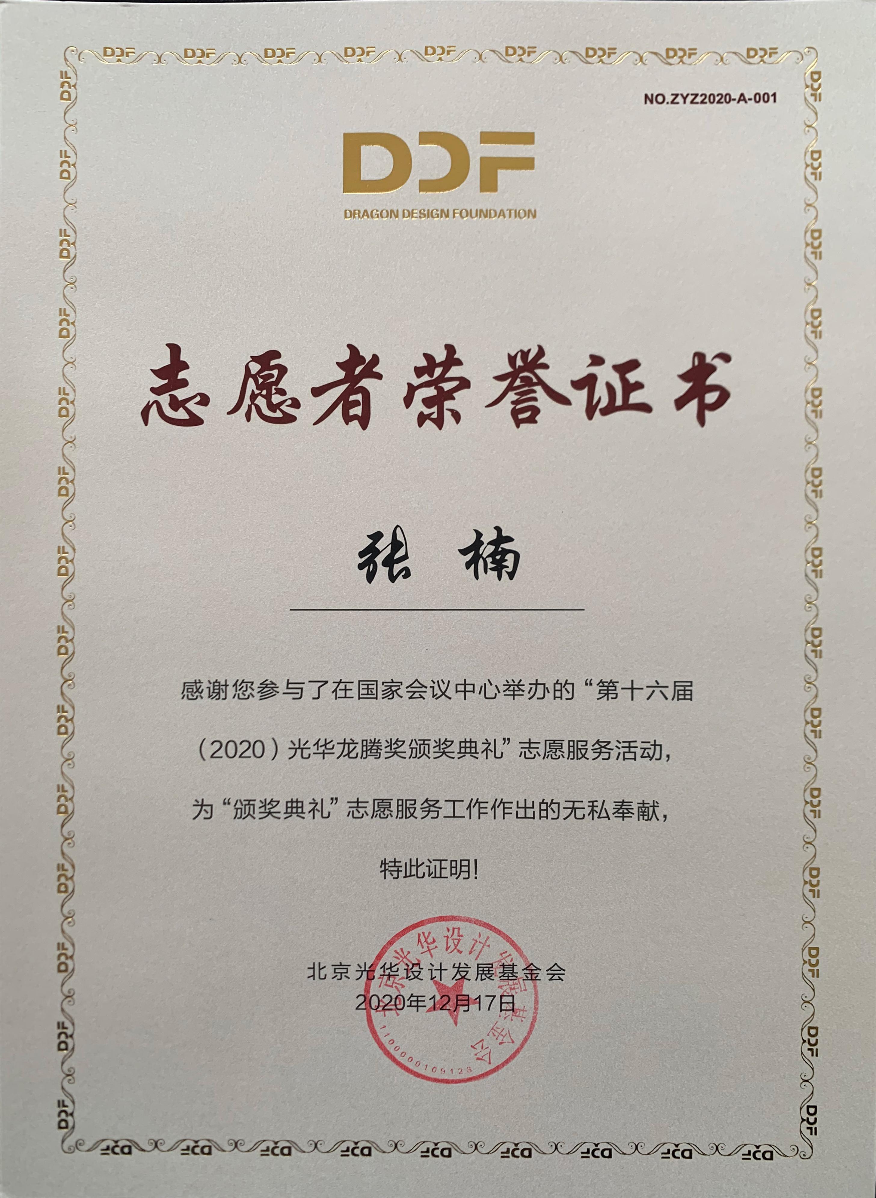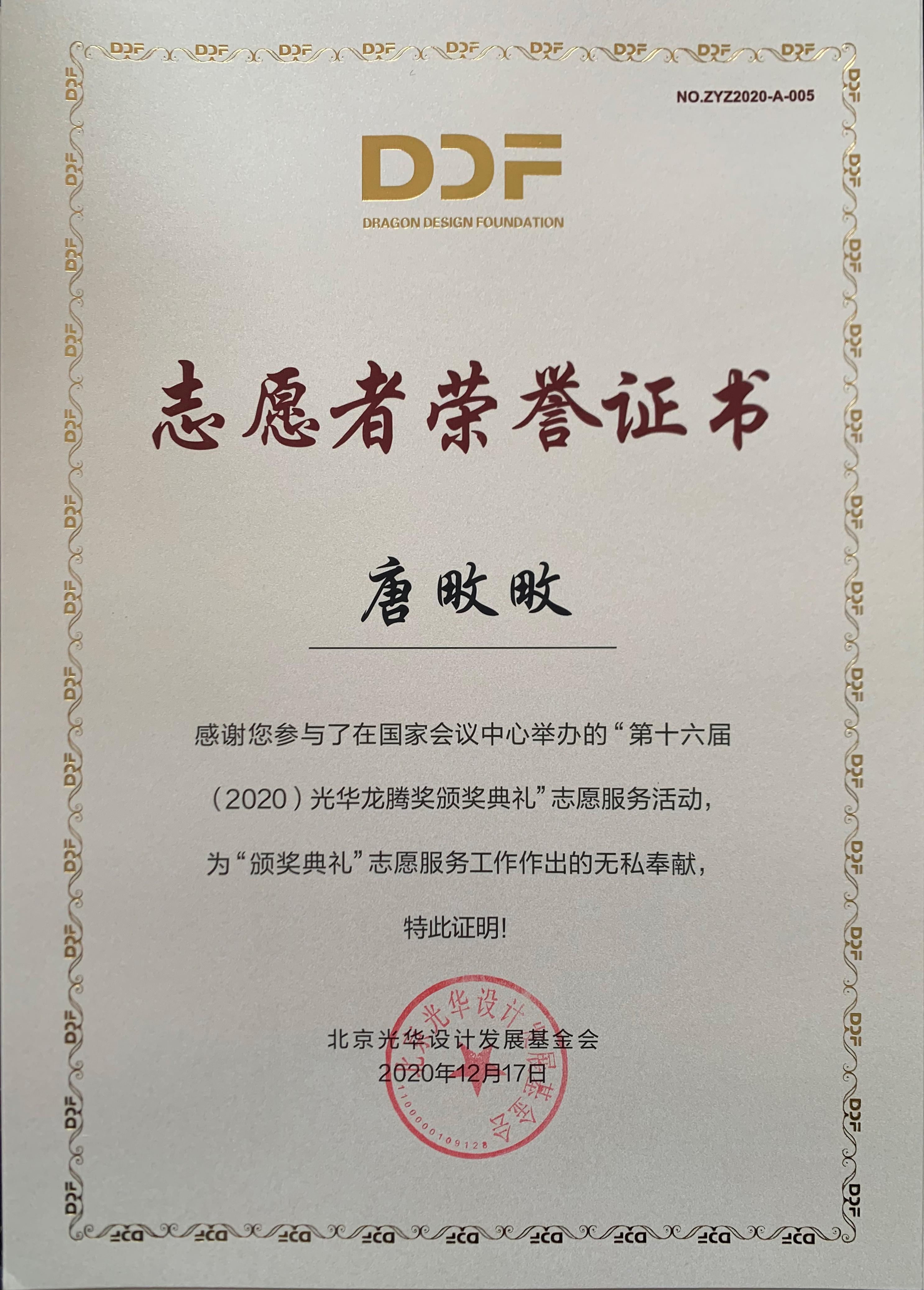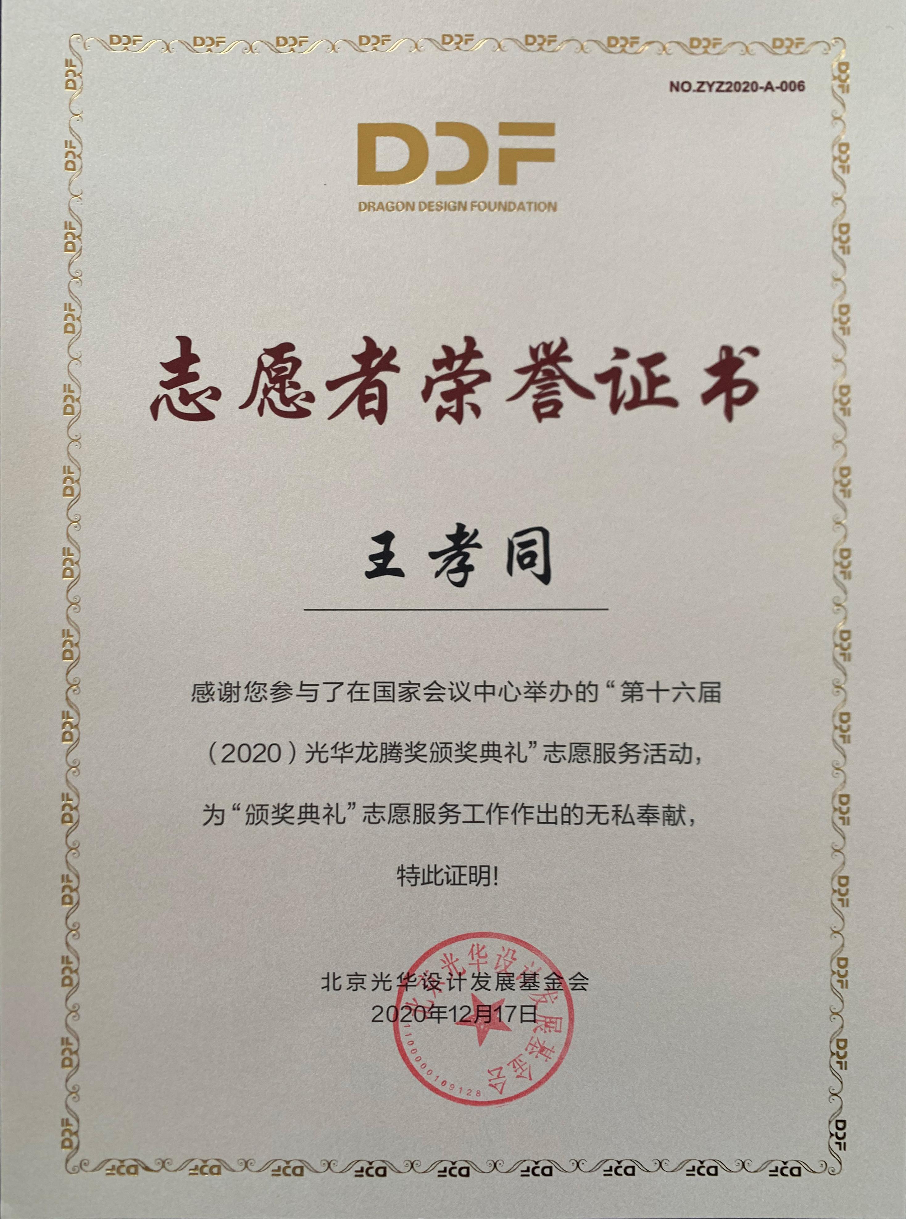 2020年12月17日上午,第十六届(2020)光华龙腾奖颁奖典礼在国家会议中心隆重举行。济南大学美术与设计学院荣誉院长柳冠中被授予“光华龙腾奖委员会荣誉主席”称号。美术与设计学院杨海波老师指导的“光华-济南大学志愿服务队”为北京光华设计发展基金会相关活动作了大量设计志愿服务工作,得到组委会高度肯定并获颁志愿者荣誉证书。