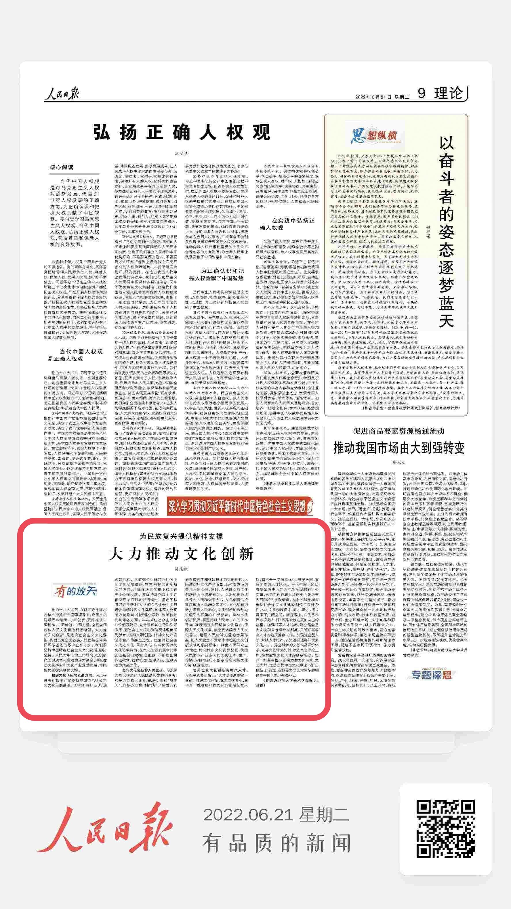 文章指出,大力推动文化创新,是建设社会主义文化强国、巩固全党全国各族人民团结奋斗共同思想基础的题中应有之义。把握文化创新的发展方向,注重用社会主义先进文化、革命文化、中华优秀传统文化培根铸魂。坚守文化创新的人民立场,要坚持以人民为中心的工作导向,准确把握人民精神文化需求,保障人民文化权益,推出更多满足人民文化需求、增强人民精神力量的优秀作品。培养造就文化创新高层次人才,新征程上,文化艺术界必须把人才队伍建设放在更加突出的位置。