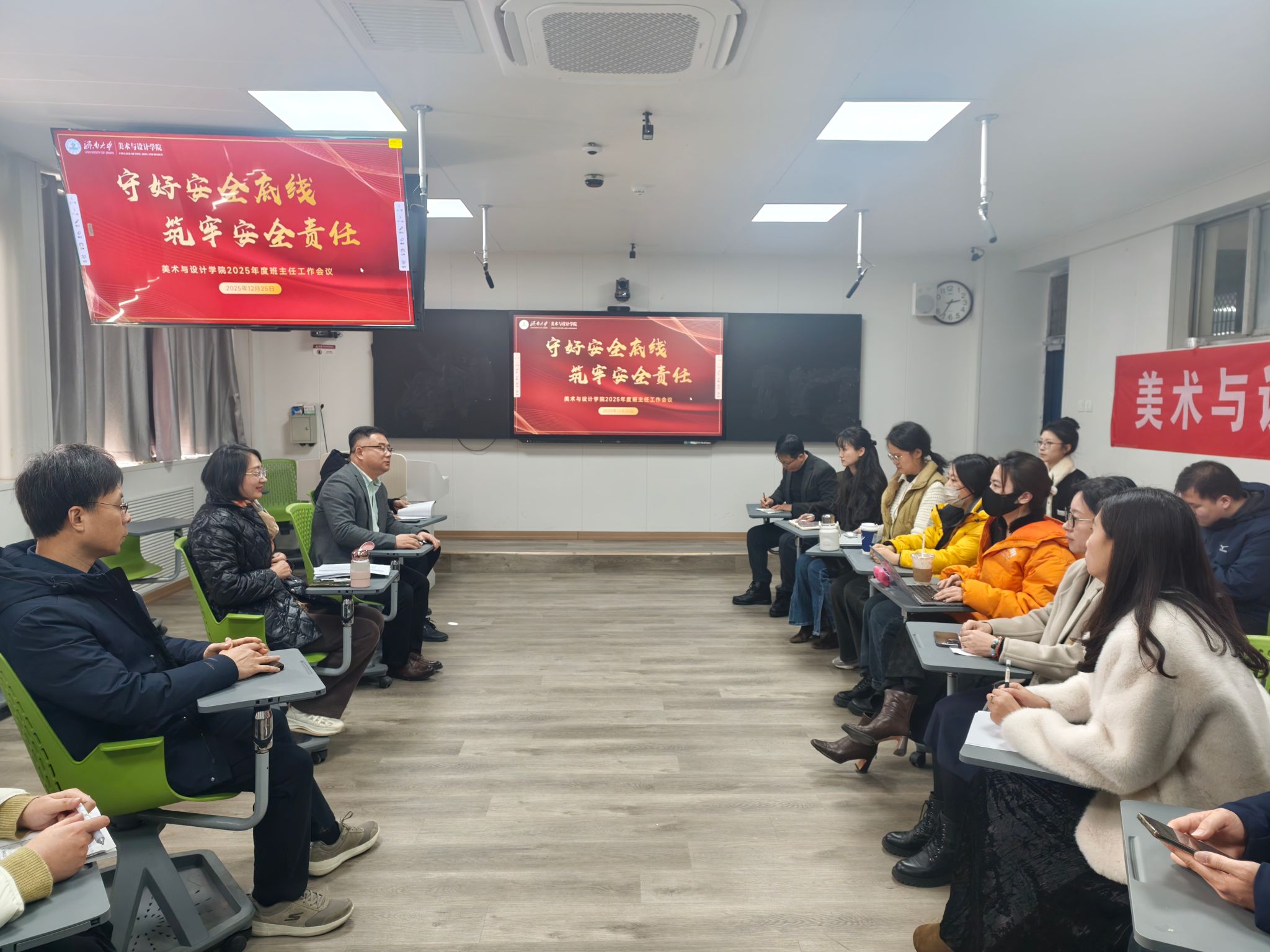 为进一步压紧压实班主任工作责任,全面提升学院班级治理水平和育人实效,12月25日下午,美术与设计学院在第4教学楼304教室召开“守牢安全底线 筑牢安全责任”2025年度班主任工作会议。学院党委书记陈春锋、副院长赵忠超及班主任代表参加会议。会议由学院党委副书记、副院长何贵亮主持。
