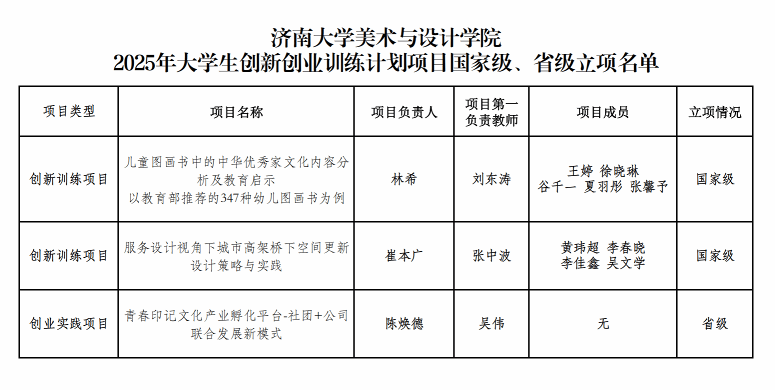 历来高度重视大学生创新创业教育,为持续提高国家级大学生创新训练计划申报质量,深化创新创业教育改革,学院师生结合美术与设计学科特色,立足创新训练与实践探索等多个维度,聚焦行业前沿与社会需求,深挖潜力,逐步形成系统化的创新训练体系。本次多个项目的成功申报,彰显了学院创新创业育人实效。