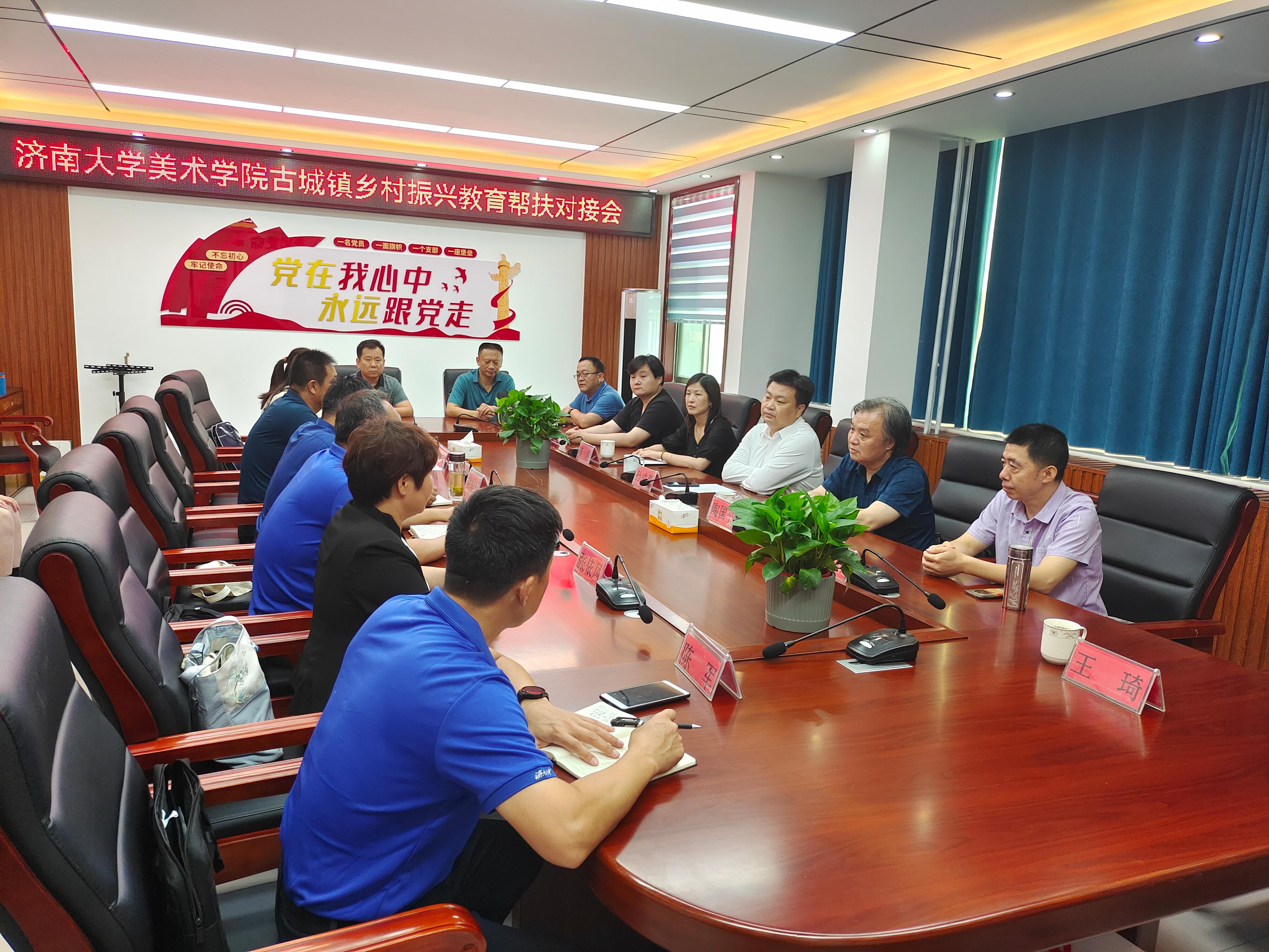 6月28日,美术学院到济南大学省派第一书记服务地聊城莘县古城镇开展乡村振兴教育帮扶对接活动,莘县教体局党组成员胡绍东、古城镇党委书记丁伟华、济南大学省派第一书记徐兵、陈军、张依凤、赵萍及相应主管部门科长、镇中小学校校长出席了活动。美术学院党委书记孙成豪、常务副院长陶国平、党委副书记、副院长李莉、系主任陈炜、团委书记张虎、辅导员王琦及10名学生参加了活动。座谈会由济南大学省派第一书记徐兵主持。