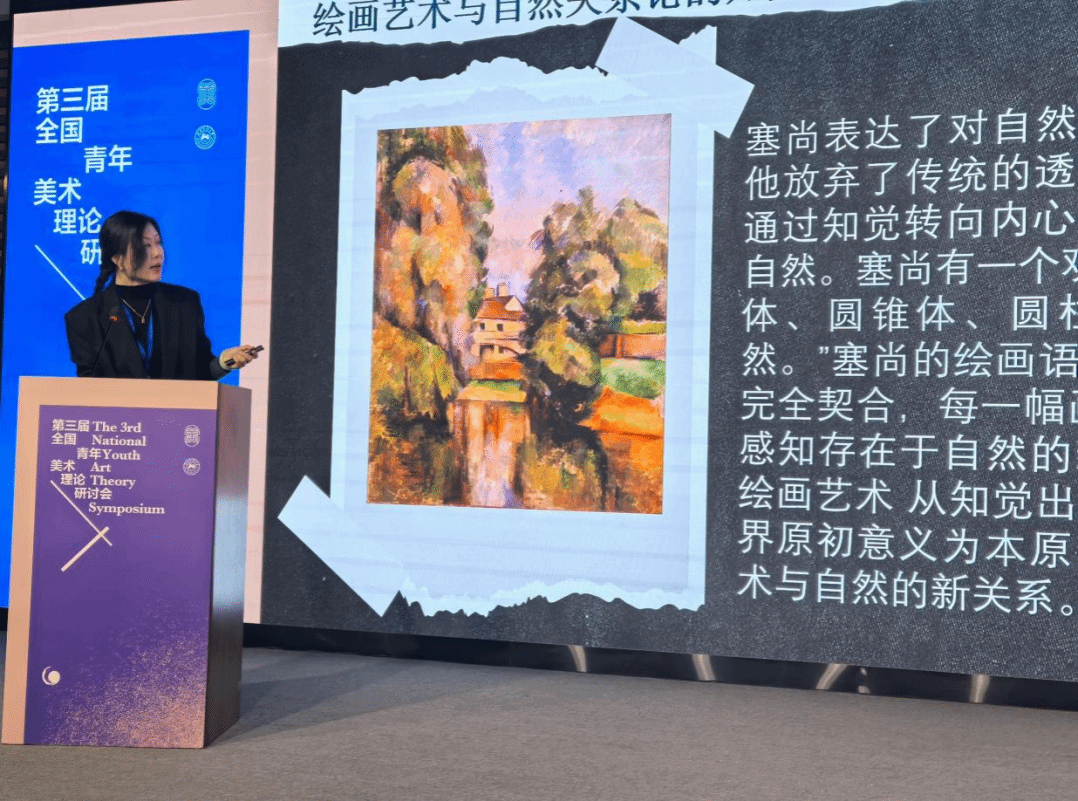张嫣格在“中外美术史及比较与交流”单元发表精彩演讲,深入分析了塞尚的艺术理念对现代绘画中人与自然关系的深刻影响,通过独特的研究视角和详实的艺术史资料,阐述了塞尚如何通过“知觉的觉醒”改变了传统绘画对自然的描绘方式,引发了与会者对绘画本质和艺术创新的深入思考。