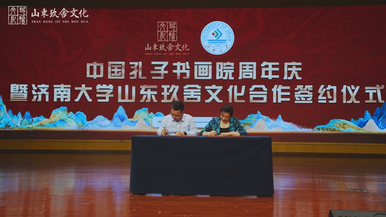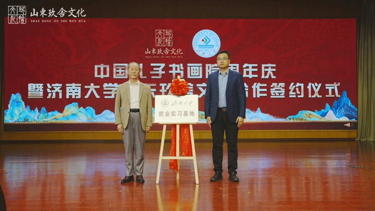 仪式上,山东玖舍文化艺术传媒有限公司董事长陈虹和总经理贾南分别与济南大学相关部门负责人签署了济南大学-山东玖舍文化艺术传媒有限公司实践教学、就业实习基地合作协议书,共同为“济南大学实践教学基地”、“济南大学就业实习基地”揭牌。