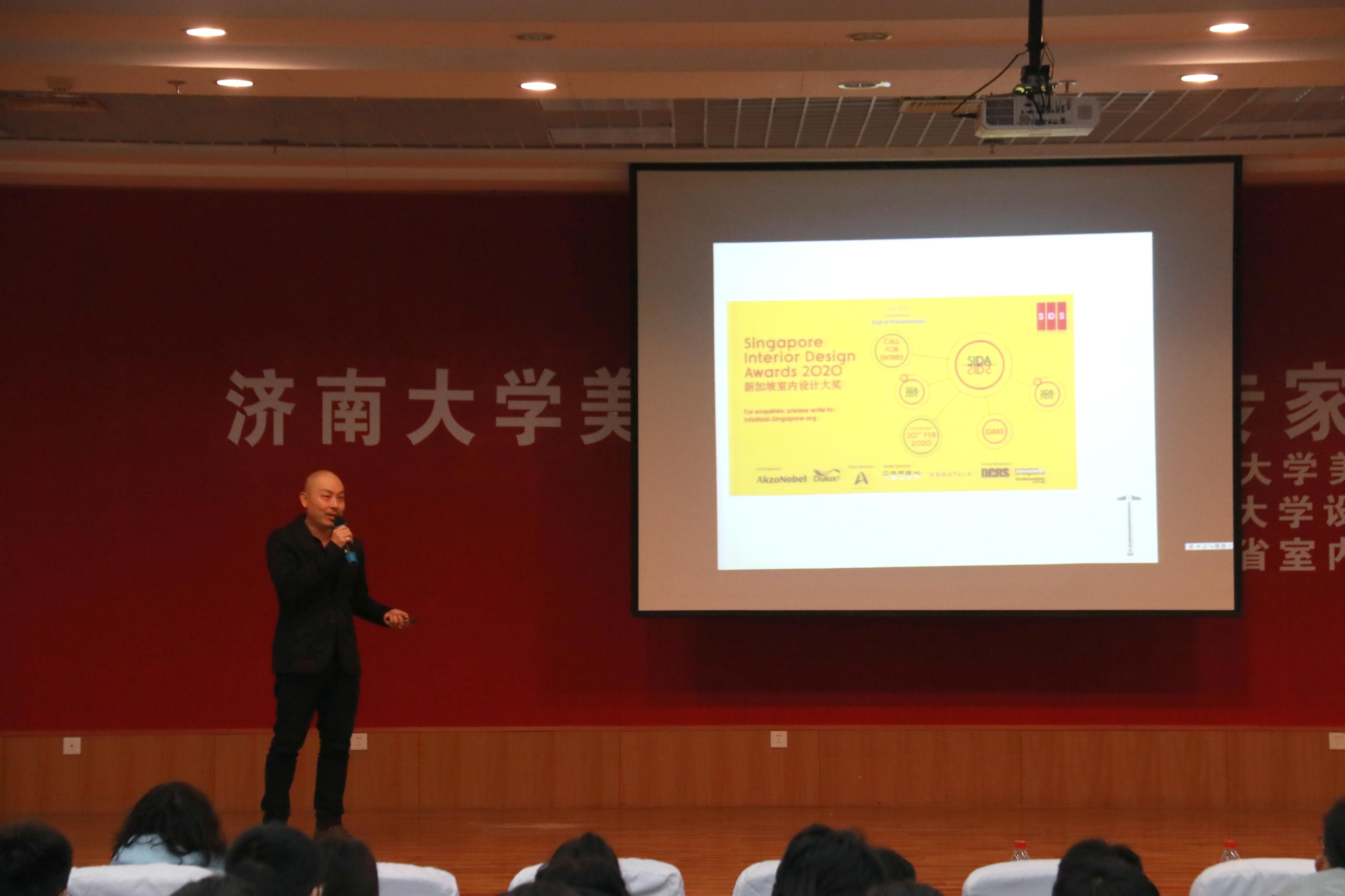 为进一步提高学生对于设计理念的理解,进行设计思维的多元碰撞,2020年1月5日上午9时,济南大学美术与设计学院在第二报告厅举行了一场别开生面的专家报告会,由新加坡室内设计师协会理事长王胜杰先生主讲。济南大学党委常委、副校长李光红、山东省室内设计行业协会秘书长何金朔、美术与设计学院党委书记郝军、副书记刘军、环艺系主任李红梅,辅导员王鹏飞、王琦及学院300多位师生代表参加了本次专家报告会。报告会由美术与设计学院副院长杨海波主持。
