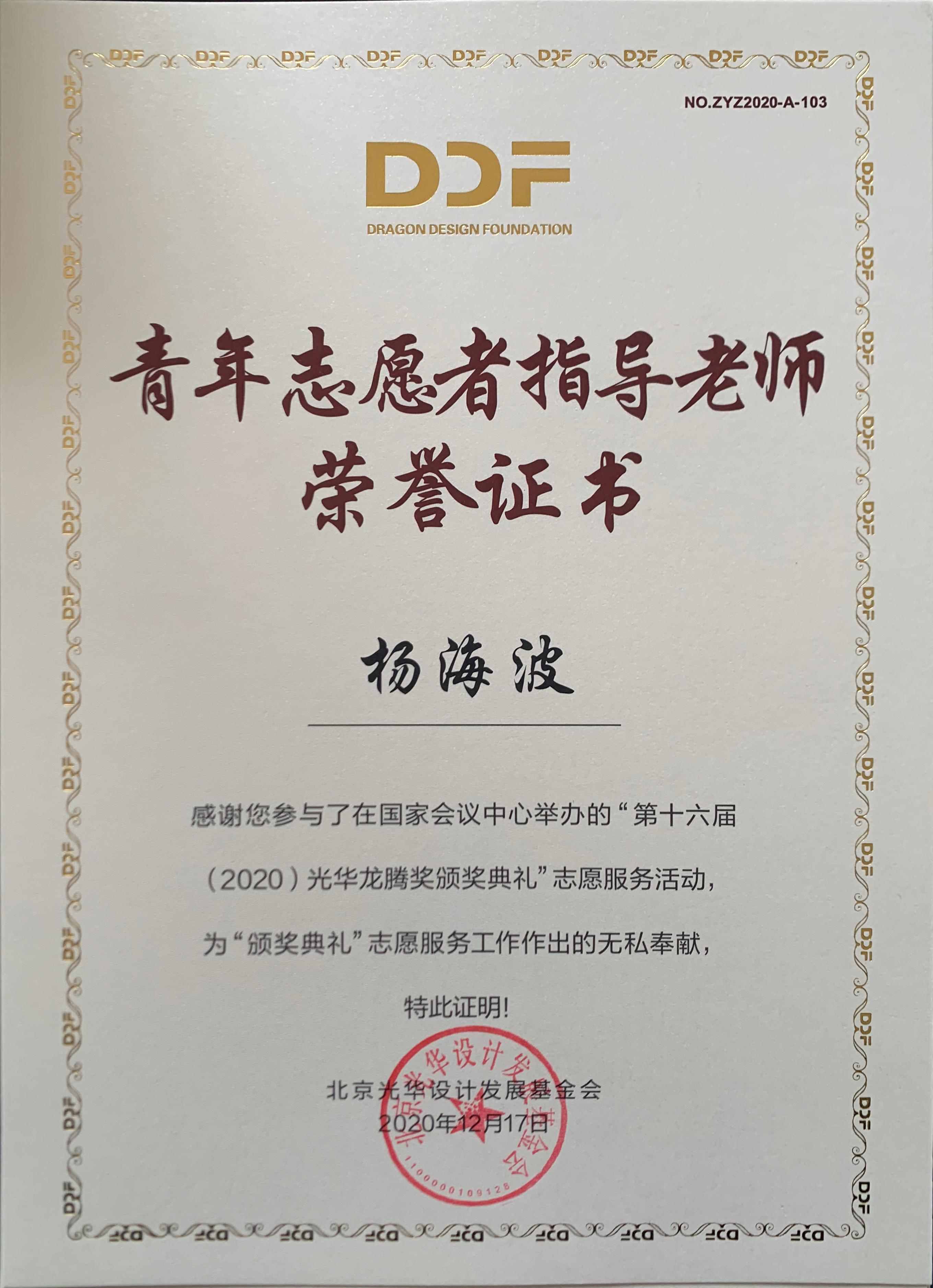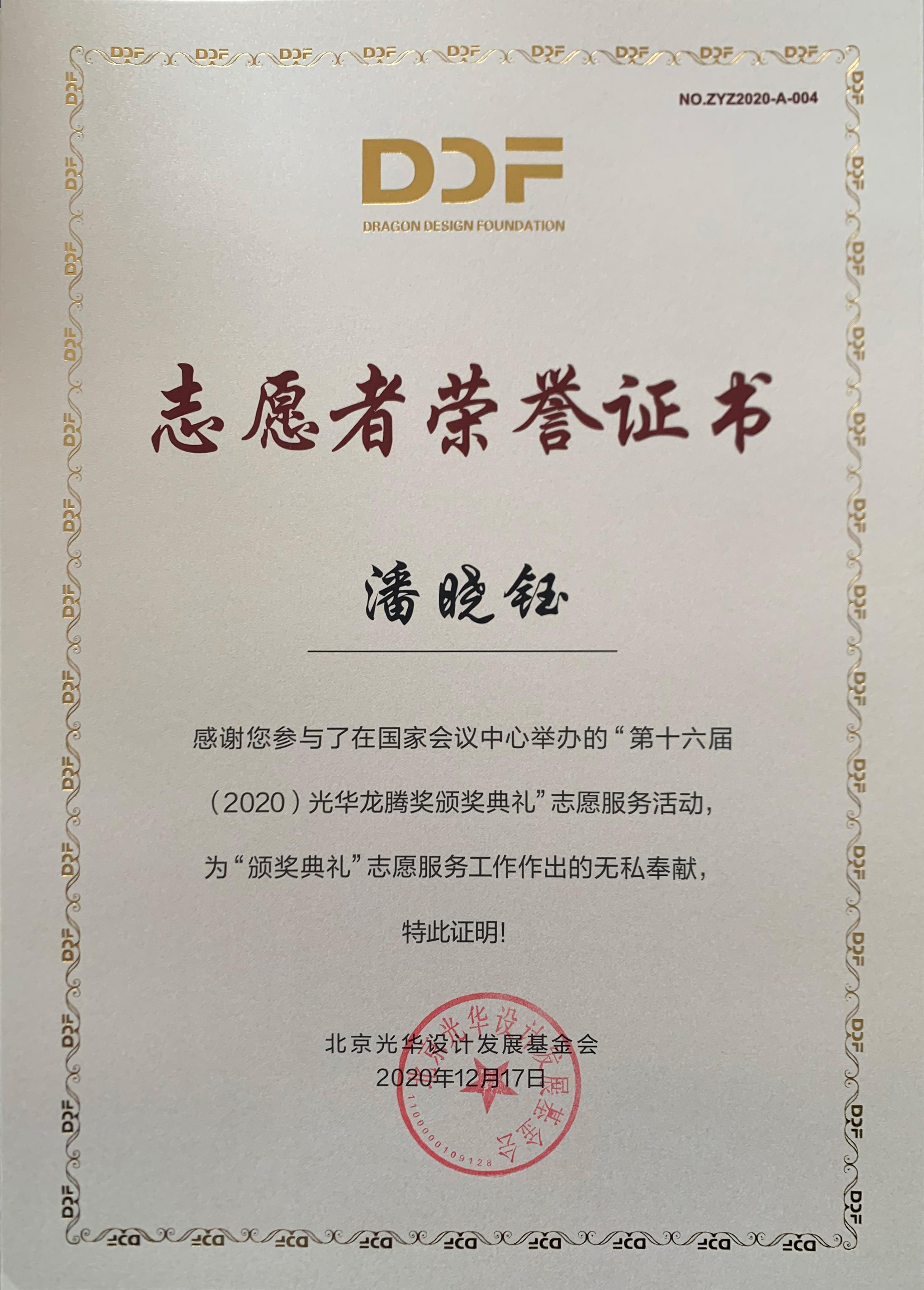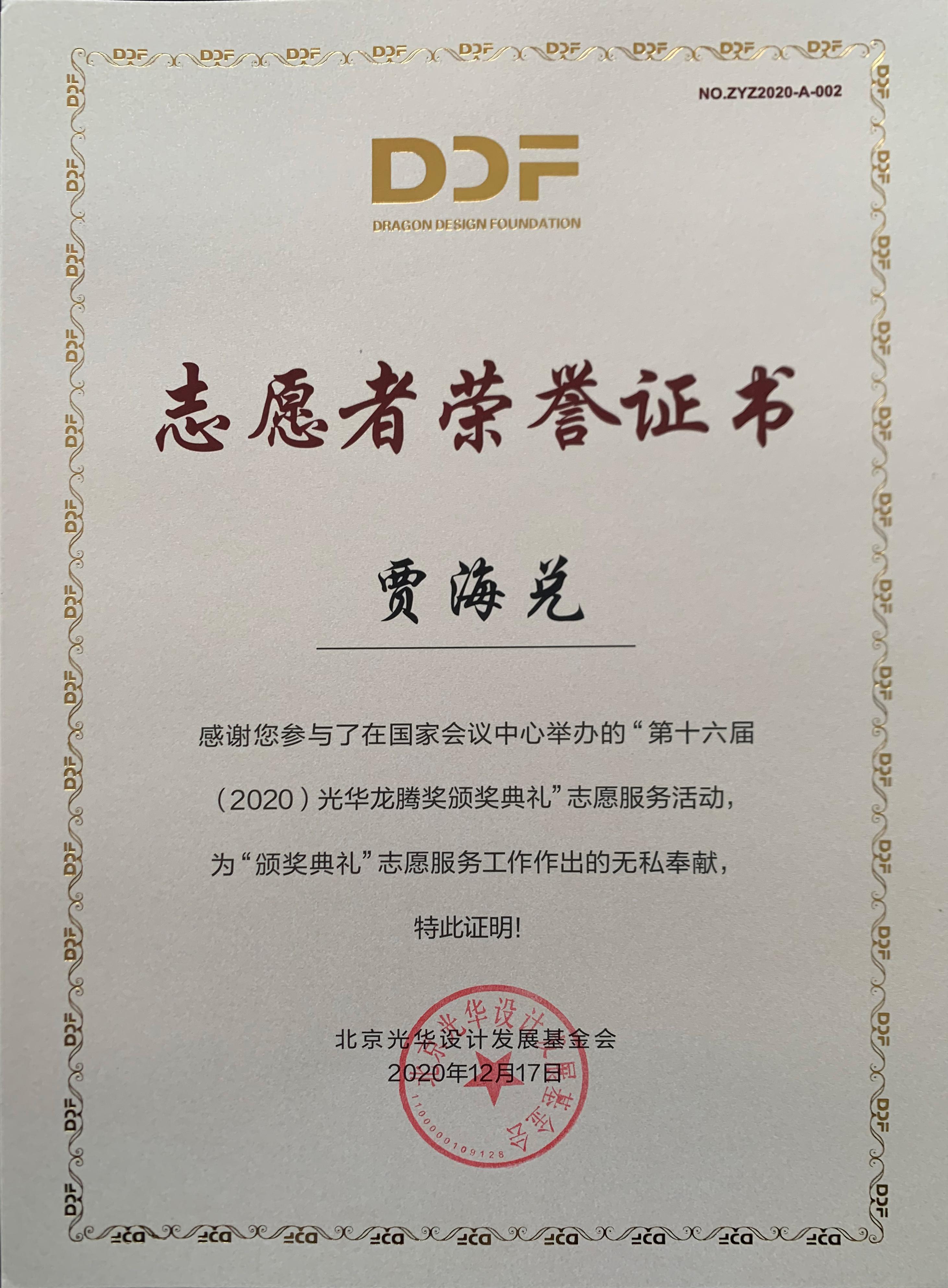 2020年12月17日上午,第十六届(2020)光华龙腾奖颁奖典礼在国家会议中心隆重举行。济南大学美术与设计学院荣誉院长柳冠中被授予“光华龙腾奖委员会荣誉主席”称号。美术与设计学院杨海波老师指导的“光华-济南大学志愿服务队”为北京光华设计发展基金会相关活动作了大量设计志愿服务工作,得到组委会高度肯定并获颁志愿者荣誉证书。