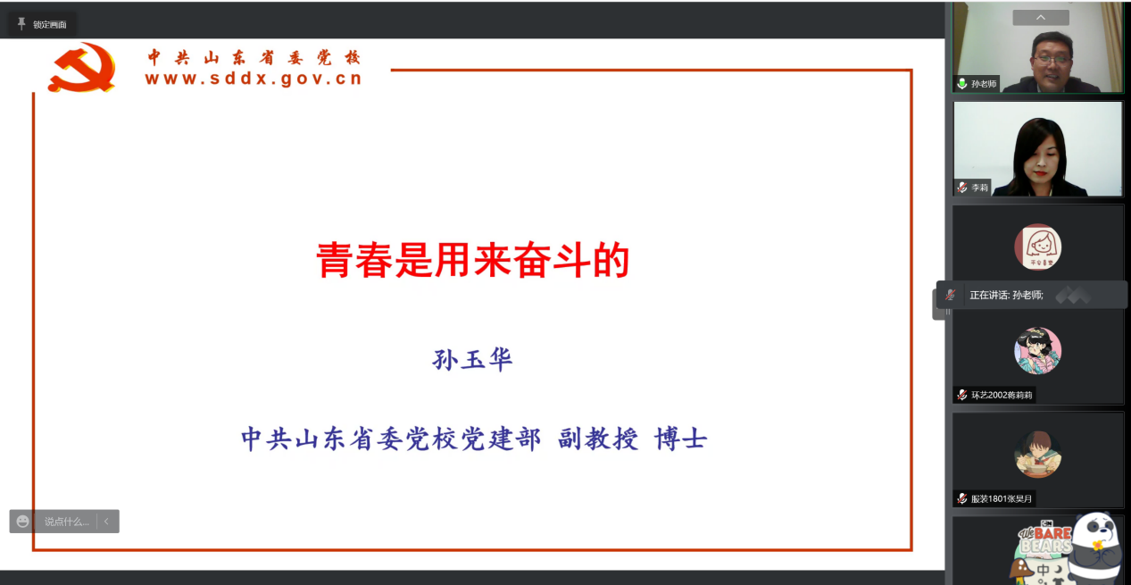 3月26日晚,美术学院线上开展“青春是用来奋斗的”主题党课,特邀中共山东省委党校(行政学院)党建部孙玉华教授主讲,学院学生党支部书记、全体学生党员和入党积极分子共计260余人参加,本次主题党课由美术学院党委副书记、副院长李莉主持。