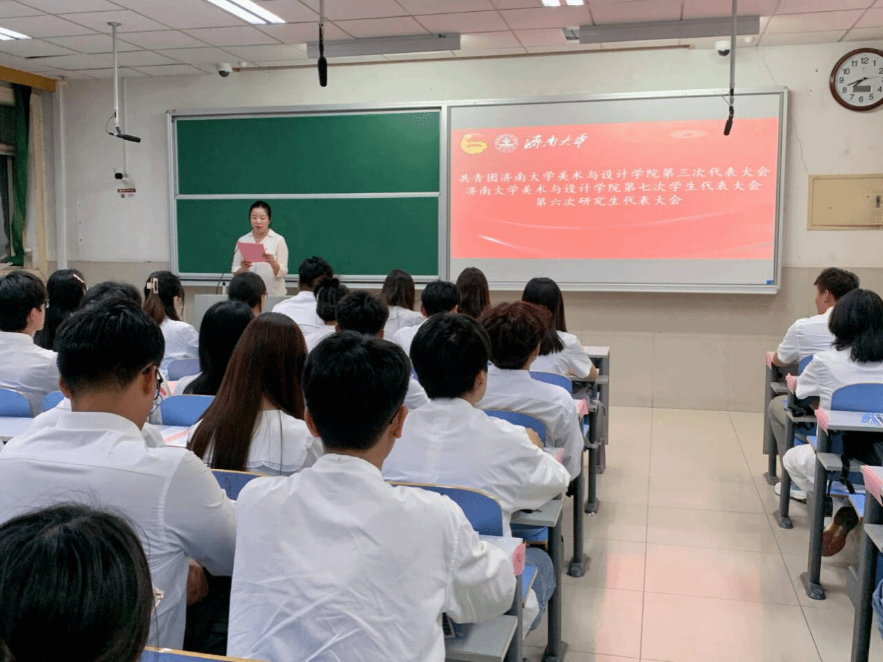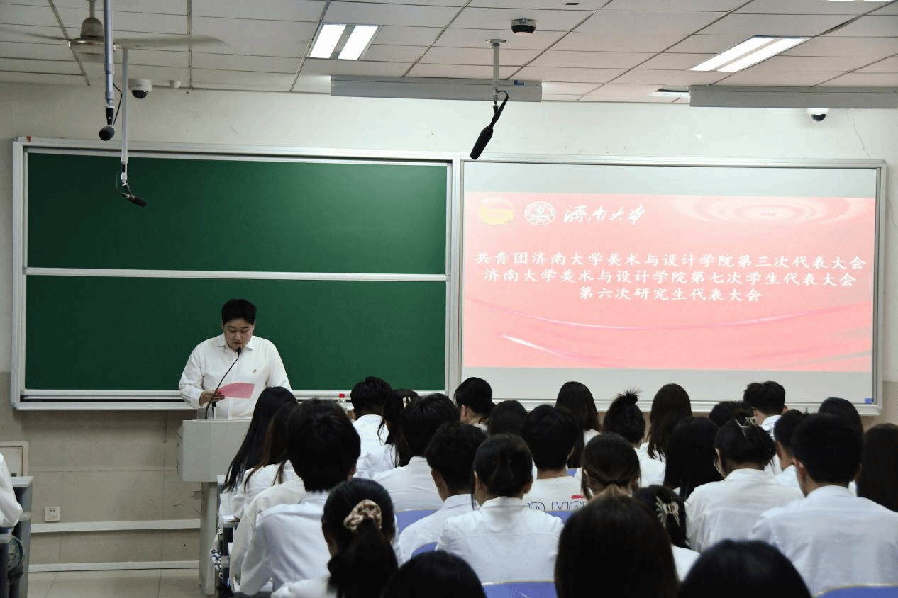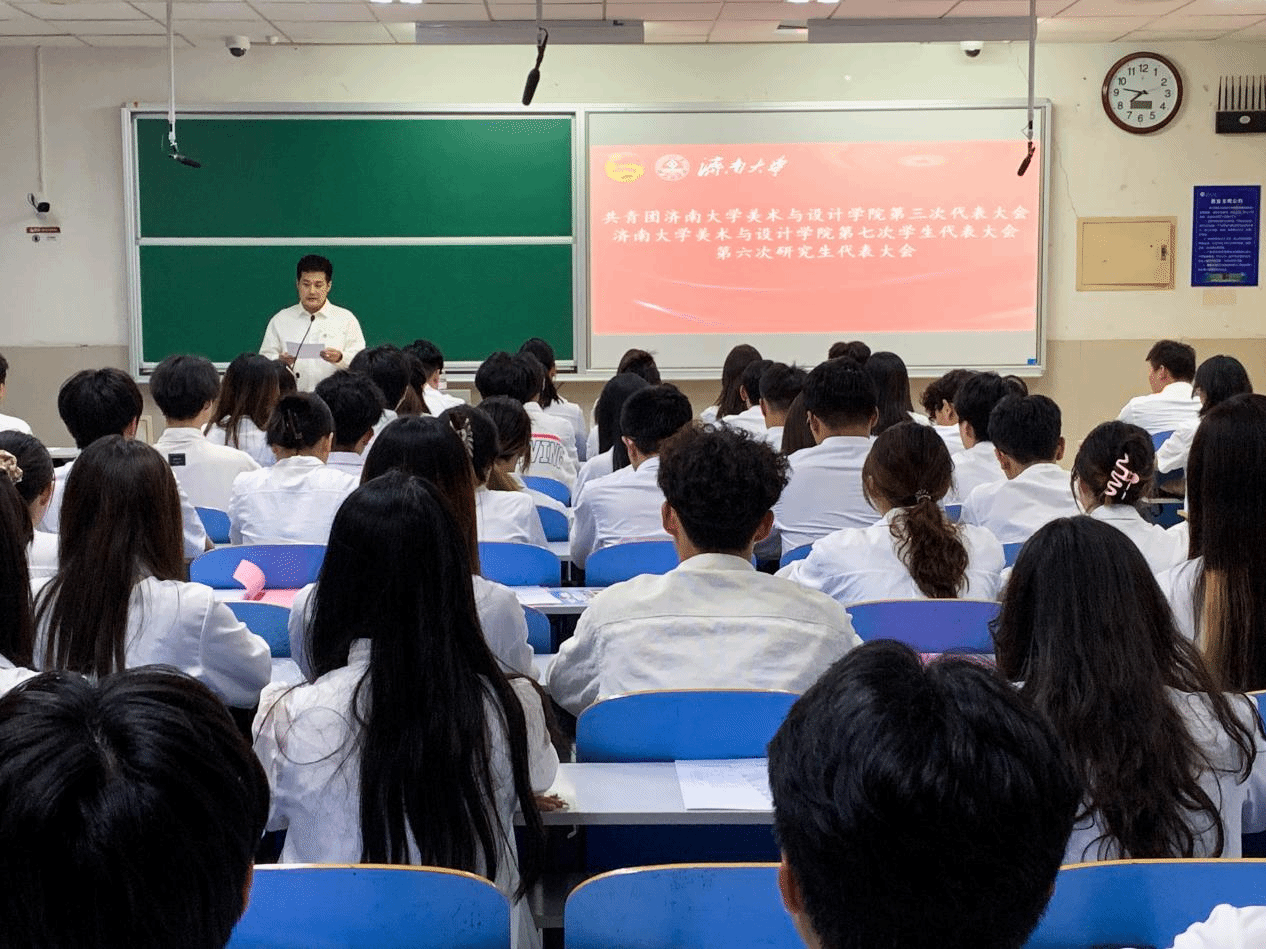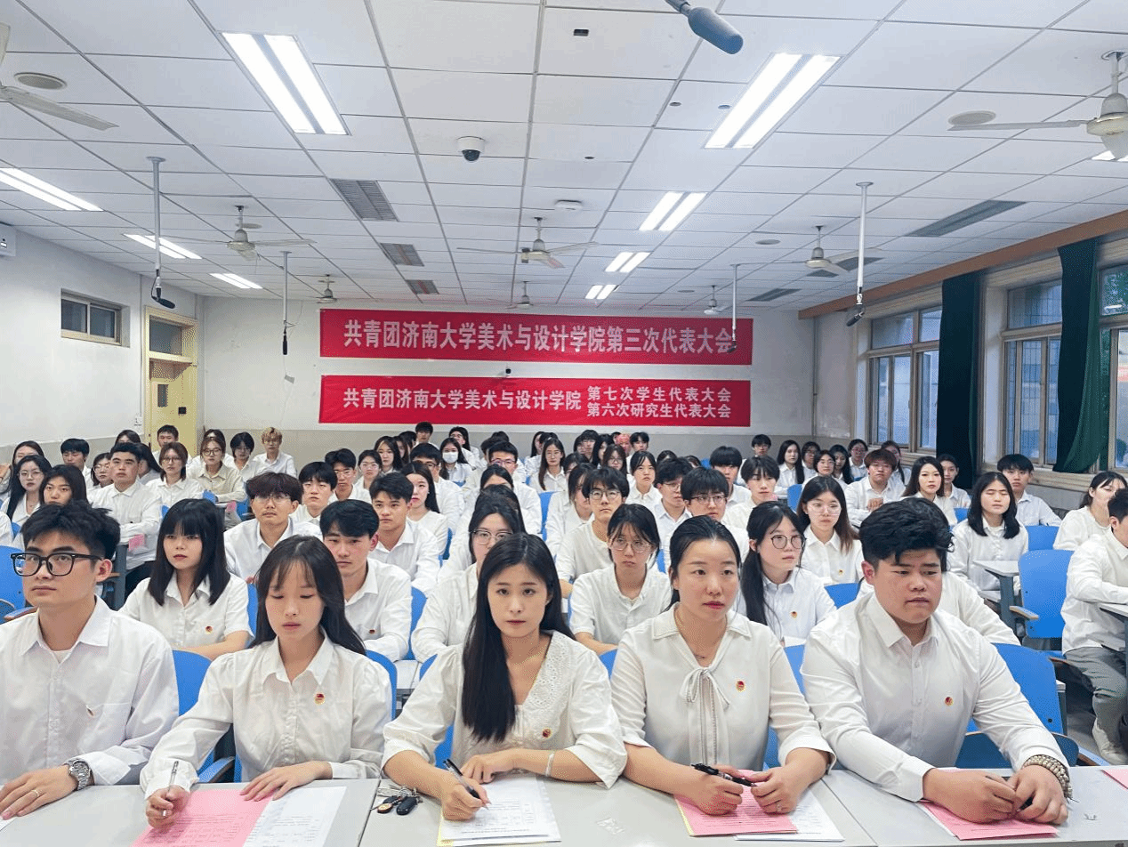 2024年5月20日,共青团济南大学美术与设计学院第三次代表大会、济南大学美术与设计学院第七次学生代表大会、第六次研究生代表大会隆重召开。会议由美术与设计学院学生会主席团成员韩诗杭主持,美术与设计学院团委书记王琦和学院100余名学生代表参加会议。