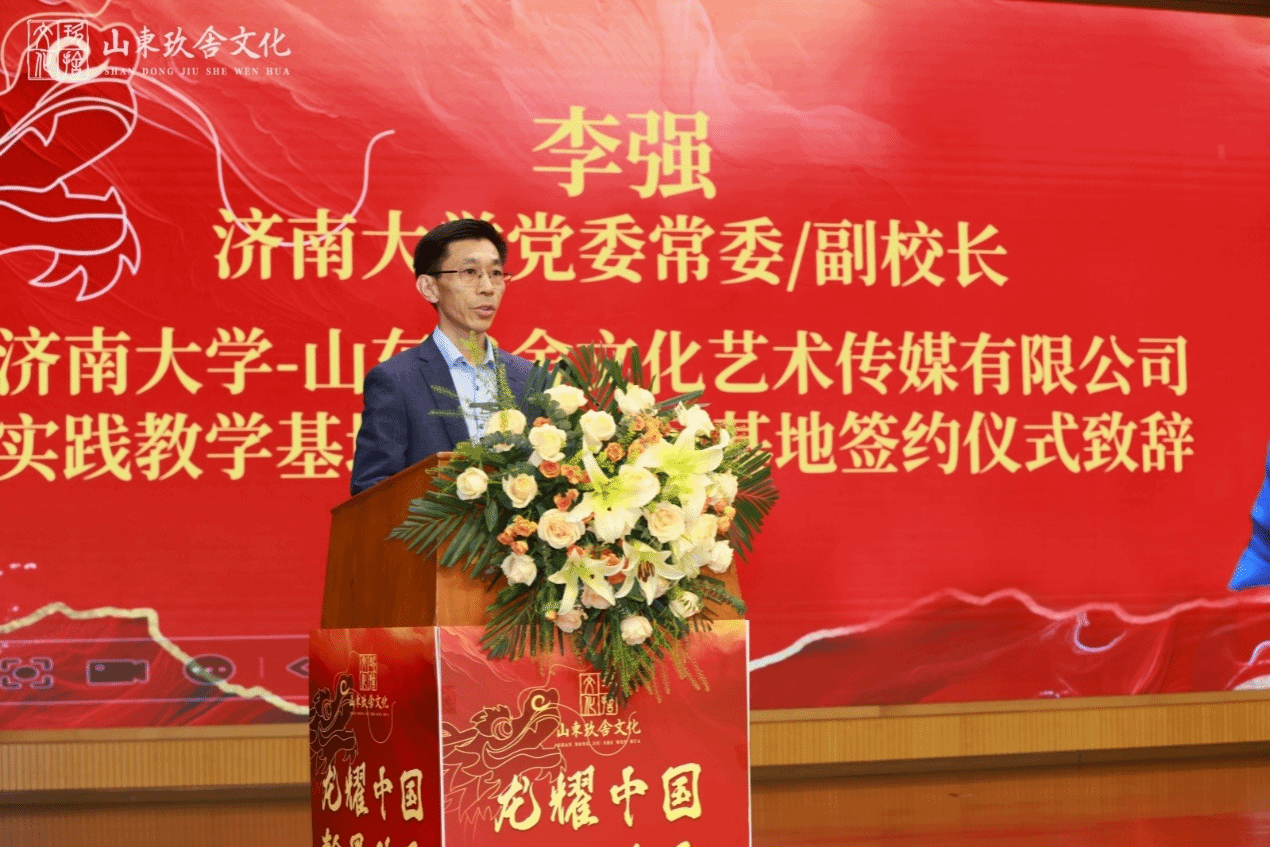 李强代表学校对山东玖舍文化艺术传媒有限公司支持学校教育发展表示感谢,介绍了学校在人才培养、科学研究、师资队伍、学科建设等方面的基本情况。他指出,共同搭建校企联合平台,开展深入合作,是推动济南大学与山东玖舍文化艺术传媒有限公司发挥各自资源优势、提升企业创新能力和水平、提高学校人才培养能力、实现互利共赢的有益尝试。济南大学近年来高度重视美育工作,不断探索新形势下美术专业学生培养模式,希望校企双方进一步加强密切交流,深化拓展合作领域,实现更加紧密的产学研一体化发展,用更加开放的视野、更加有力的措施共同推进协议全面落实。
