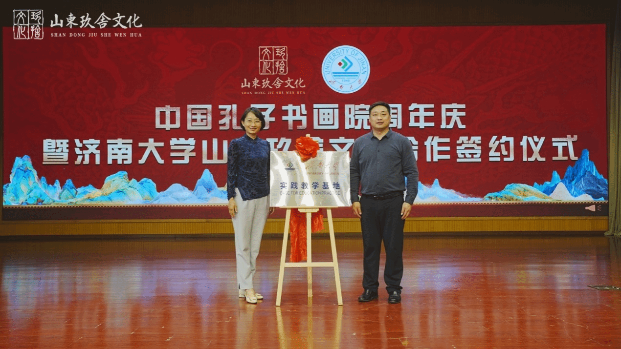仪式上,山东玖舍文化艺术传媒有限公司董事长陈虹和总经理贾南分别与济南大学相关部门负责人签署了济南大学-山东玖舍文化艺术传媒有限公司实践教学、就业实习基地合作协议书,共同为“济南大学实践教学基地”、“济南大学就业实习基地”揭牌。