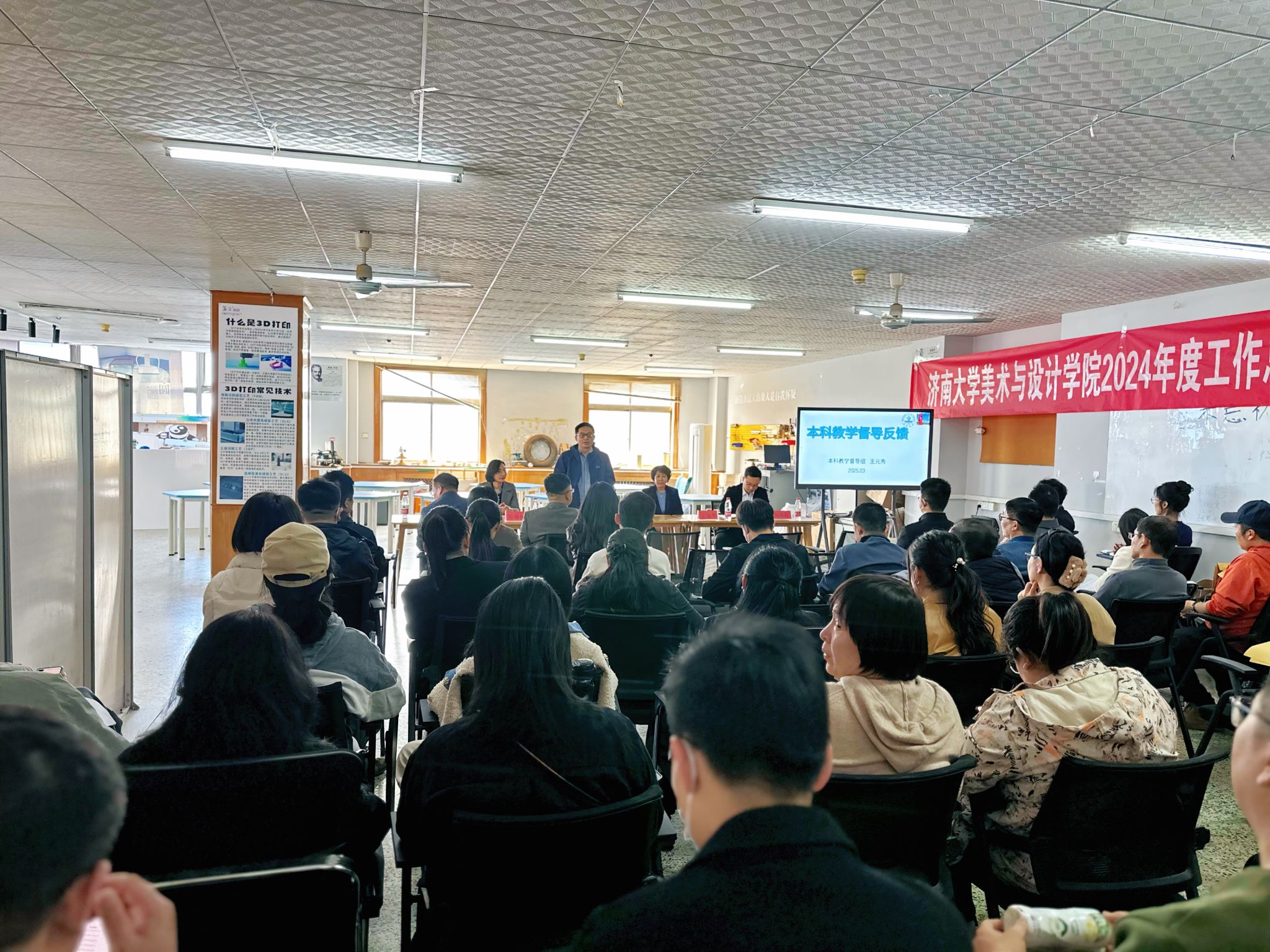 为进一步推动学院本科教学质量稳步提升,3月25日下午,美术与设计学院举行本科教学督导反馈会,教务处副处长、教学质量与评估办公室副主任张杰,本科教学督导组组长王元秀,学院领导班子,学院本科教学督导员和全体教师参加活动。会议由美术与设计学院副院长杨海波主持。