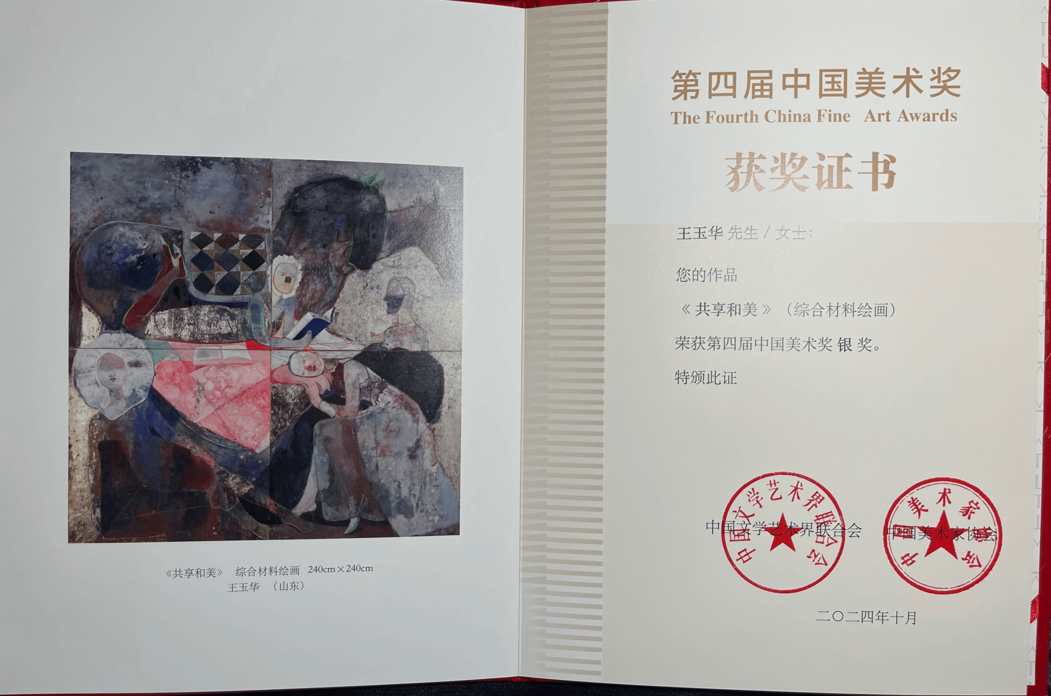 在“中国美术奖”颁奖仪式上,我省作者表现出色,共取得两银一铜的优异成绩。其中,济南大学美术与设计学院美术系综合材料绘画教研室主任王玉华副教授的综合材料绘画作品《共享和美》,荣获第四届“中国美术奖”银奖,这不仅是全国十四届美展综合材料绘画领域的最高奖项,更代表着我校美术综合材料绘画首次在“中国美术奖”评选中取得重大突破,为我校赢得了极高的荣誉与肯定。
