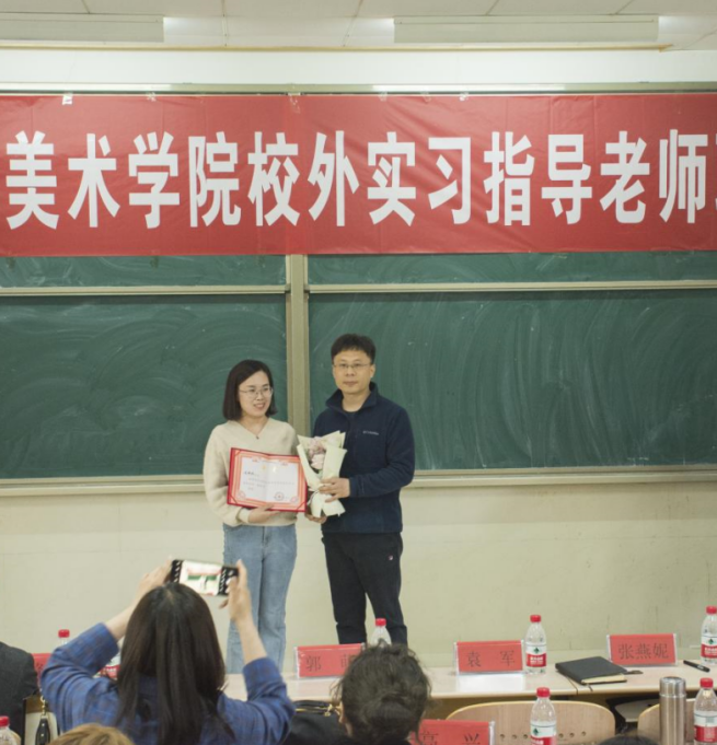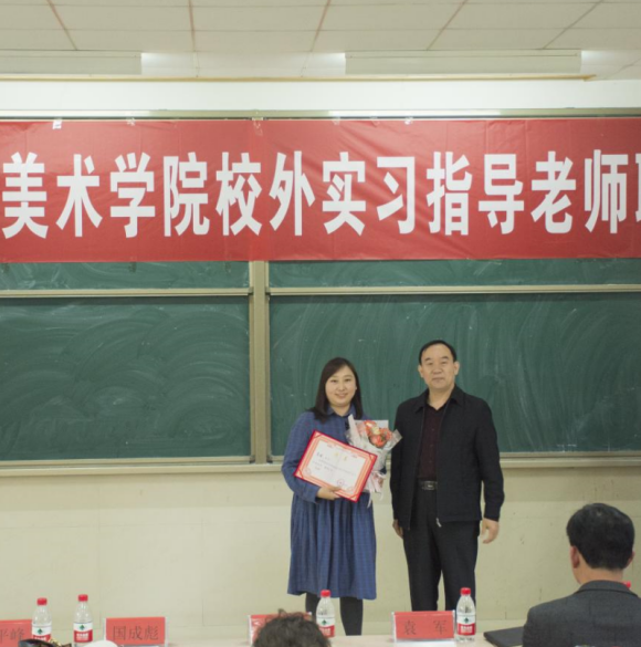 会议第一阶段为聘任仪式,孙成豪书记、刘军书记、赵忠超副院长分别为13位校外实习指导教师颁发了聘书。赵忠超副院长介绍了济南大学美术学院的办学历史、美术学师范专业特色与近年来取得的教学成果,并对美术学专业的人才培养方案做了详细的说明。校外实习指导教师代表——山大辅仁学校教师许孔重、校内实习指导教师代表——美术系副主任马立洪,学生代表——油画2001班刘执昊依次发言。
